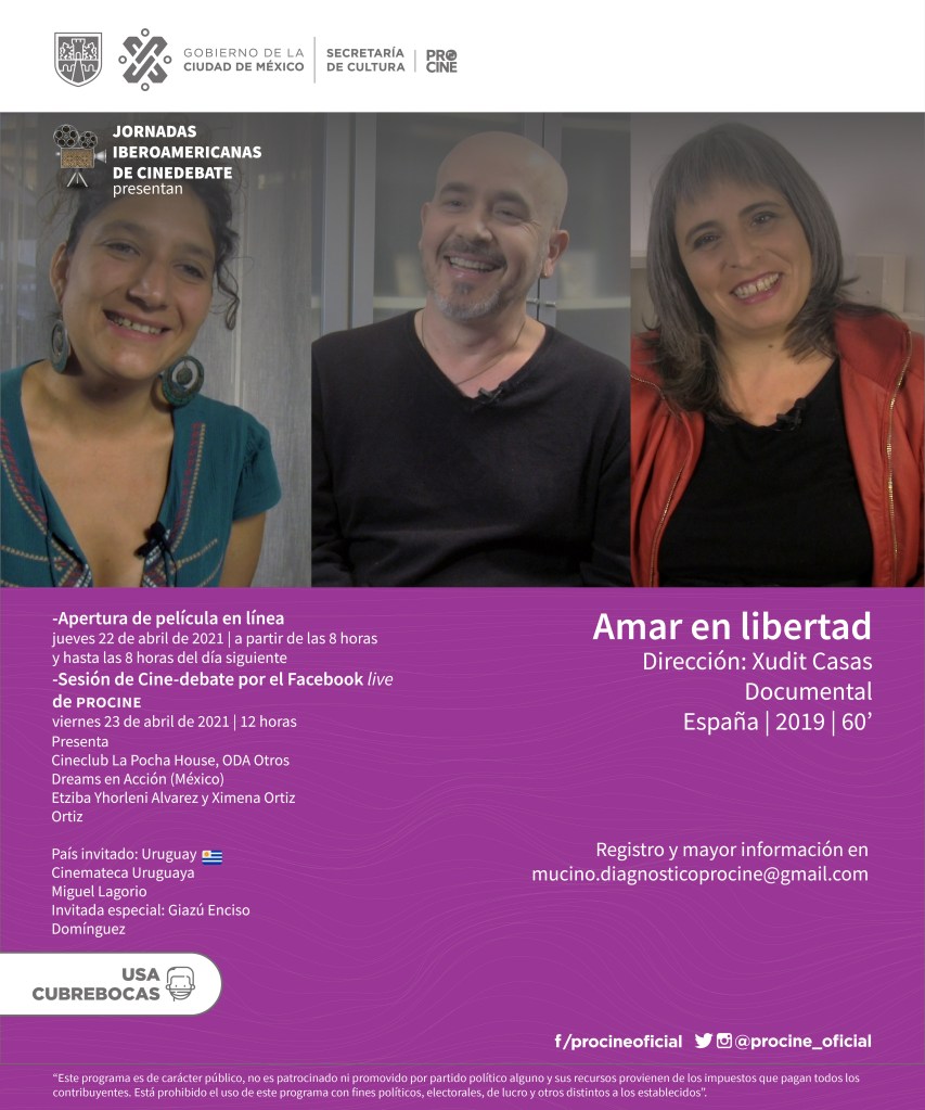 La sesión de Cine-debate con Xudit Casas por el Facebook Live de PROCINE el viernes, 23 de abril a las 12 horas mexicanas (19h españolas). Presenta Cineclub La Pocha House, ODA Otros Dreams en Acción (México), Etziba Yhorleni y Ximena Ortiz. País invitado: Uruguay. Cinemateca Uruguaya, Miguel Lagorio. Invitada especial: Giazú Enciso.